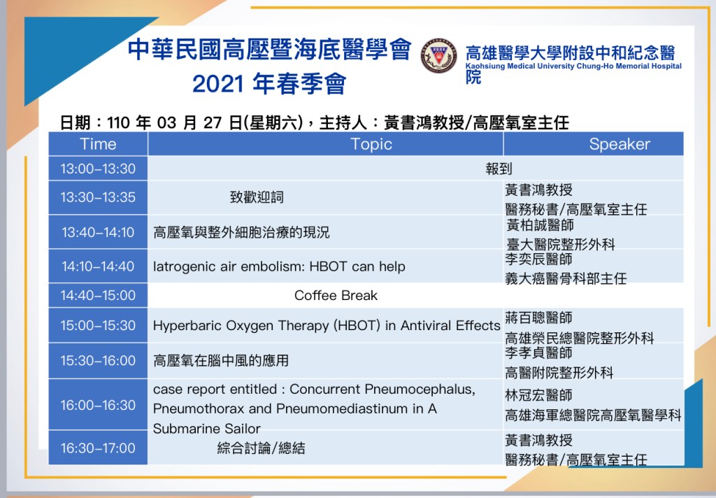 2021年3月27日 於高雄醫學大學 舉辦中華民國高壓暨海底醫學會春季會