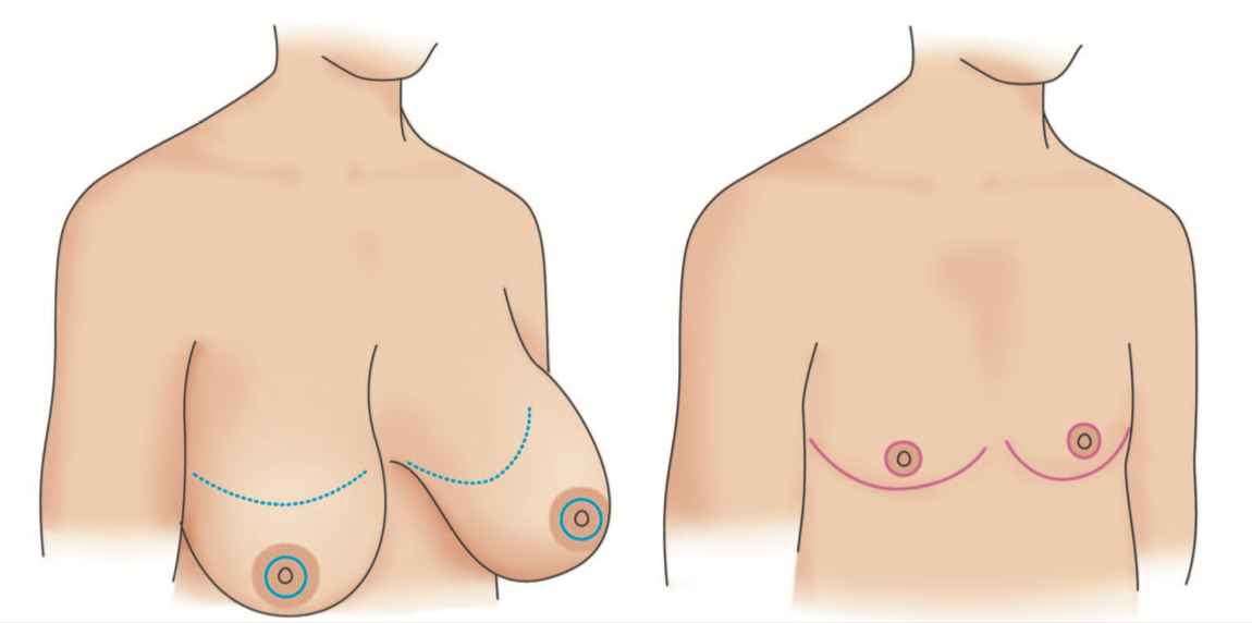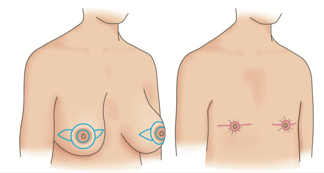 4. D罩杯或合併2-3度的乳房下垂的情況,建議行全乳房切除並將乳頭移植到新的位置,這樣的缺點是會有長長的橫向的疤痕,乳頭有部分壞死的風險,有疤痕的體質患者要考慮其風險。