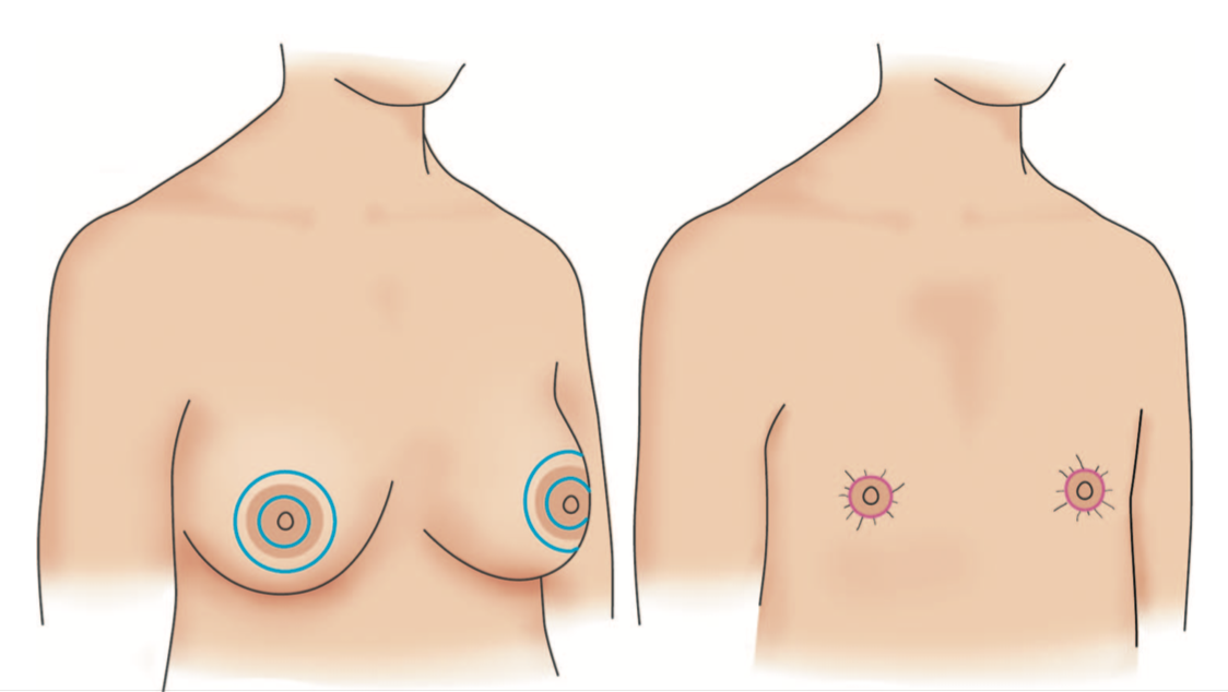 2. B罩杯的情況適合從乳暈內緣與外緣,做同心圓的方式下刀進行手術