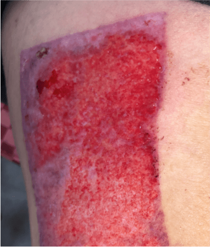 薄層皮膚移植:用於大面積補皮,如燙傷、肢體皮膚重建,缺點:色素沈澱比較明顯、容易疤痕攣縮、皮膚耐受度差 (比較容易因摩擦產生水泡)。