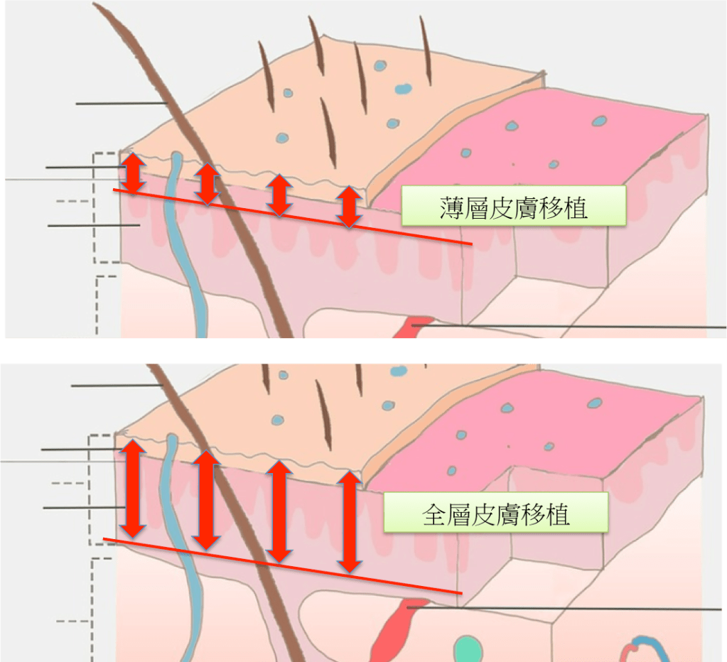 首先認識全層皮膚移植與薄層皮膚移植: