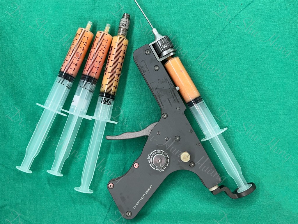 臉部利用專業脂肪槍(MAFT Gun),可以精準控制每次脂肪施打的劑量。