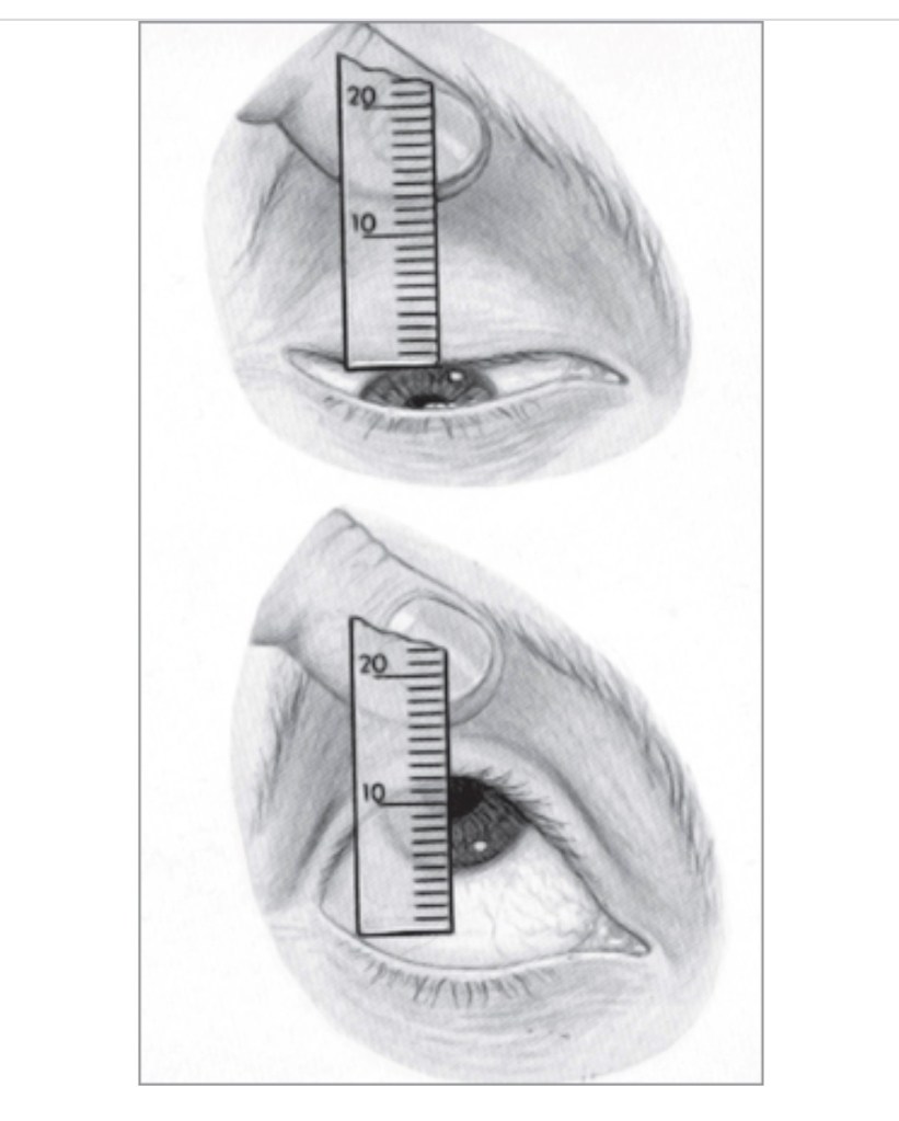 醫師用手壓住病人額頭、眉毛,請病人向下看,再向上看,用尺測量上下移動的距離
