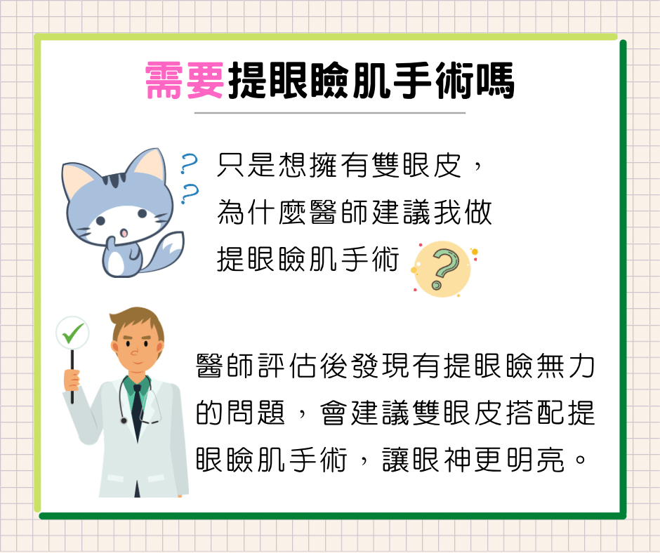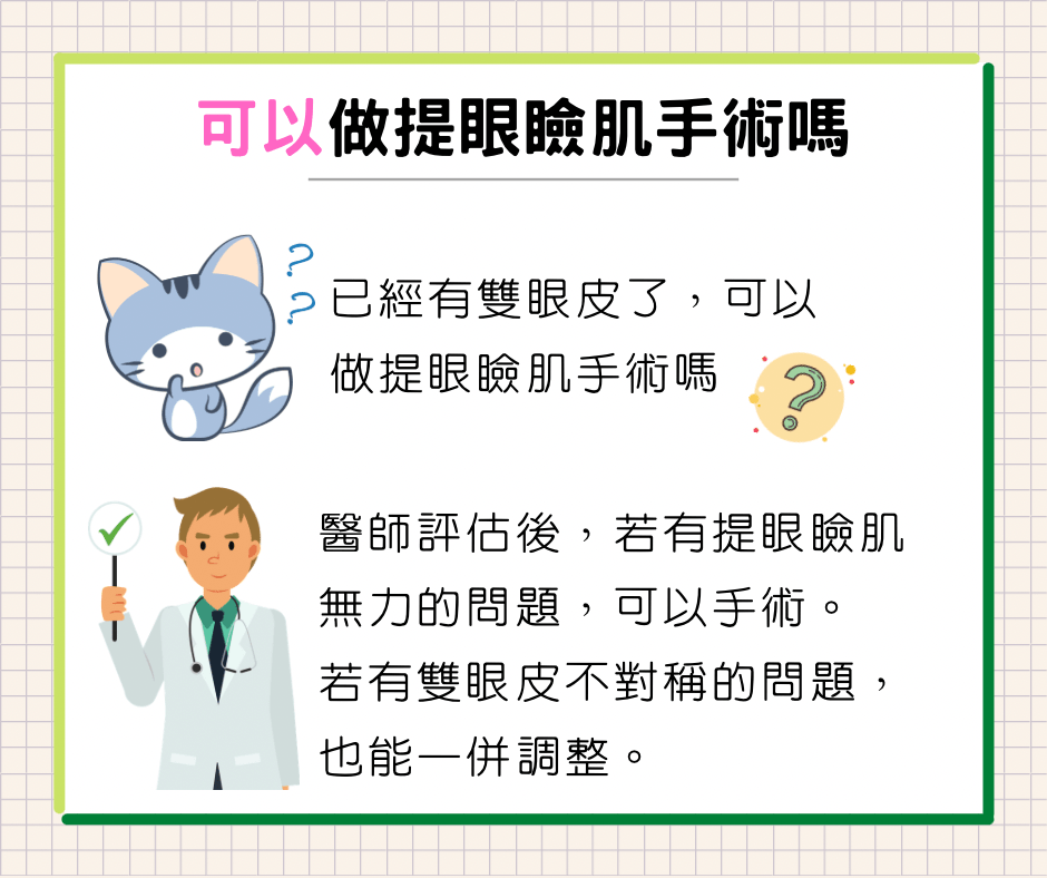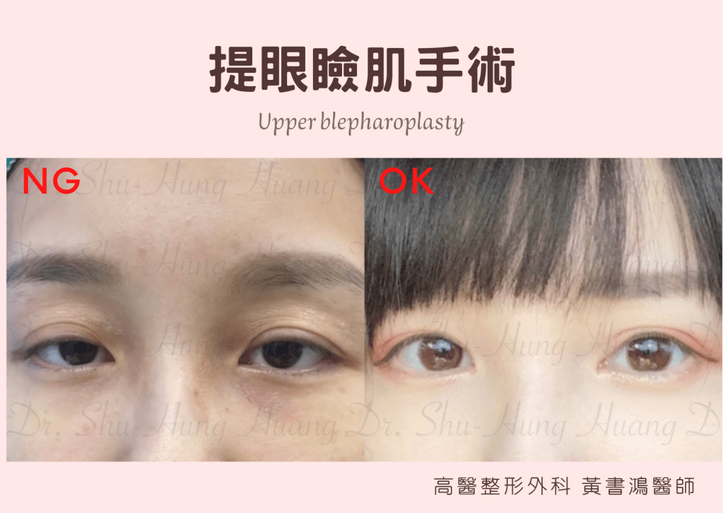 醫師經檢查評估提眼瞼肌功能、下垂程度後,決定採行術式。就診病人依情況不同,所採行術式會有所差異。術後可能會有不對稱的情況,需做後續調整。