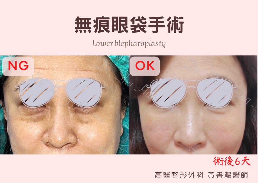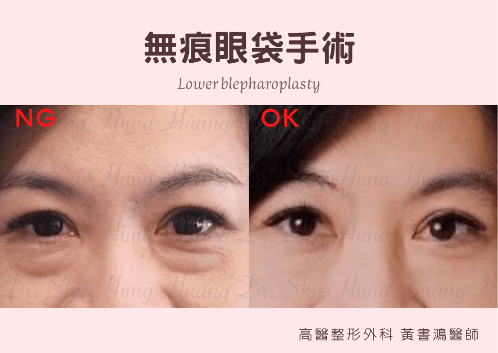 - 嚴重程度因人而異,手術目的以改善下眼周外觀為主,預期可達到改善突出眼袋、減少細紋、下眼周皮膚較為緊實。但是手術無法讓下眼周完全平坦、無痕、無細紋。
