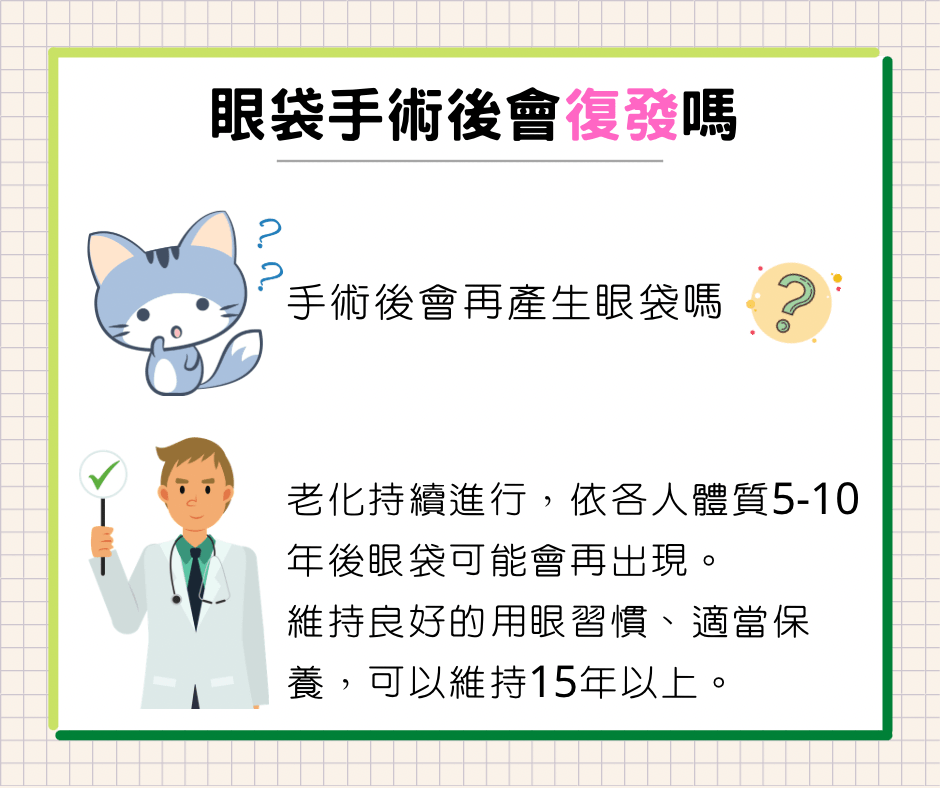 - 眼袋手術無法改善黑眼圈,因體質、生活習慣、保養方式的不同,隨著時間,自然老化的情況,5-10年後眼袋可能再次產生。
