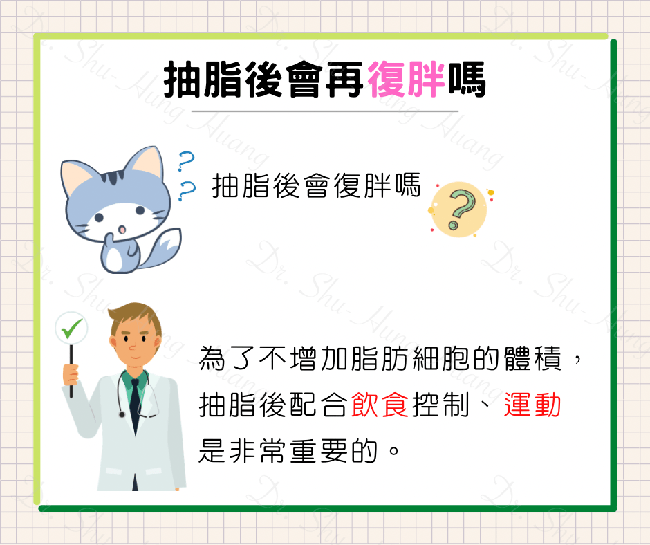 抽脂並非減肥手術,主要目的在於抽出多餘脂肪、雕塑身材,術後配合飲食控制及運動,避免脂肪體積增大,以維持抽脂塑身後最佳效果。