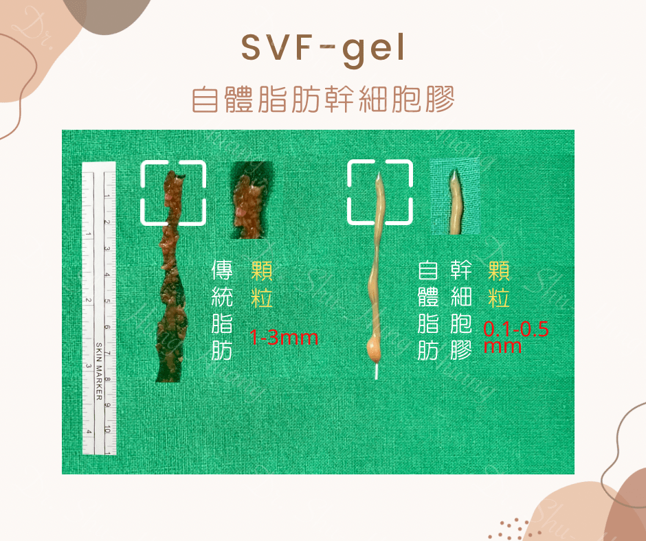 自體脂肪幹細胞膠(0.1-0.5mm)-經過特殊乳糜化技術及過濾,將脂肪顆粒更細緻化,保留更多間質細胞,去除更多雜質、破碎油脂,提高脂肪存活率,降低發炎反應。