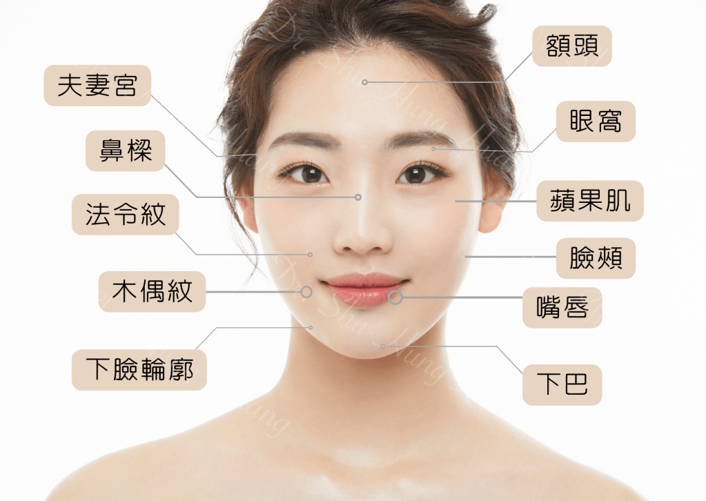 臉部-淚溝、蘋果肌、額頭、夫妻宮、法令紋、木偶紋、臉頰、眼窩、嘴唇